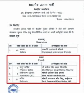 ਦਾ ਐਡੀਟਰ ਨਿਊਜ਼, ਚੰਡੀਗੜ੍ਹ —— ਭਾਜਪਾ ਨੇ ਪੰਜਾਬ ਵਿੱਚ ਲੋਕ ਸਭਾ ਚੋਣਾਂ ਲਈ ਉਮੀਦਵਾਰਾਂ ਦੀ ਦੂਜੀ ਸੂਚੀ ਜਾਰੀ ਕਰ ਦਿੱਤੀ ਹੈ। ਇਸ ਸੂਚੀ ‘ਚ ਭਾਜਪਾ ਨੇ ਤਿੰਨ ਹੋਰ ਲੋਕ ਸਭਾ ਉਮੀਦਵਾਰਾਂ ਦਾ ਐਲਾਨ ਕੀਤਾ ਹੈ। ਇਸ ਵਿੱਚ ਬਠਿੰਡਾ ਤੋਂ ਸਾਬਕਾ ਆਈਏਐਸ ਅਧਿਕਾਰੀ ਪਰਮਪਾਲ ਕੌਰ ਸਿੱਧੂ, ਹੁਸ਼ਿਆਰਪੁਰ ਤੋਂ ਅਨੀਤਾ ਸੋਮਪ੍ਰਕਾਸ਼ ਅਤੇ ਖਡੂਰ ਸਾਹਿਬ ਤੋਂ ਮਨਜੀਤ ਸਿੰਘ ਮੰਨਾ ਨੂੰ ਟਿਕਟਾਂ ਦਿੱਤੀਆਂ ਗਈਆਂ ਹਨ।