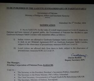 ਜਿਕਰਯੋਗ ਹੈ ਕਿ ਪੂਰੀ ਦੁਨੀਆ ਵਿਚ ਕਰੋਨਾ ਵਾਇਰਸ ਫੈਲਣ ਕਾਰਨ ਪਾਕਿਸਤਾਨ ਸਰਕਾਰ ਵੱਲੋਂ ਕਰਤਾਰਪੁਰ ਸਾਹਿਬ ਕਾਰੀਡੋਰ ਨੂੰ ਬੰਦ ਕੀਤਾ ਗਿਆ ਸੀ ਲੇਕਿਨ ਹੁਣ 2 ਅਕਤੂਬਰ ਨੂੰ ਸਰਕਾਰ ਨੇ ਇਸ ਨੂੰ ਮੁੜ ਖੋਲਣ ਦਾ ਫੈਸਲਾ ਲੈ ਲਿਆ ਹੈ। ਪਾਕਿਸਤਾਨ ਸਰਕਾਰ ਦੇ ਇਸ ਫੈਸਲੇ ਨਾਲ ਸਿੱਖ ਜਗਤ ਵਿਚ ਖੁਸ਼ੀ ਦੀ ਲਹਿਰ ਪਾਈ ਜਾ ਰਹੀ ਹੈ।