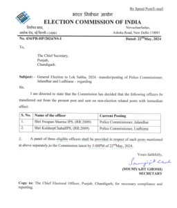 ਚੋਣ ਕਮਿਸ਼ਨ ਨੇ ਜਲੰਧਰ ਅਤੇ ਲੁਧਿਆਣਾ ਦੇ ਪੁਲਿਸ ਕਮਿਸ਼ਨਰਾਂ ਨੂੰ ਚੋਣ ਡਿਊਟੀ ਤੋਂ ਹਟਾ ਕੇ ਗੈਰ-ਚੋਣ ਡਿਊਟੀ ‘ਤੇ ਕੀਤਾ ਤਾਇਨਾਤ
