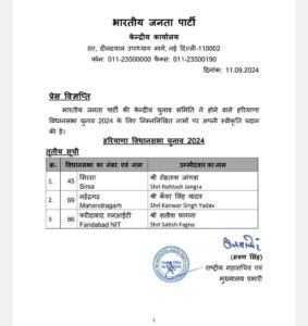 ਭਾਜਪਾ ਨੇ ਹਰਿਆਣਾ ਵਿਧਾਨ ਸਭਾ ਚੋਣਾਂ ਲਈ ਆਖਰੀ 3 ਉਮੀਦਵਾਰਾਂ ਦੀ ਸੂਚੀ ਵੀ ਕੀਤੀ ਜਾਰੀ