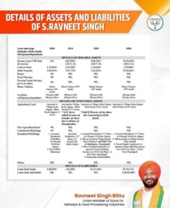 ਕੇਂਦਰੀ ਮੰਤਰੀ ਰਵਨੀਤ ਬਿੱਟੂ ਨੇ ਆਪਣੀ ਜਾਇਦਾਦ ਜਨਤਕ ਕੀਤੀ: ਸੋਸ਼ਲ ਮੀਡੀਆ ‘ਤੇ ਪਾਈ ਜਾਣਕਾਰੀ