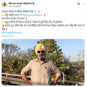 ਮਜੀਠੀਆ ਨੇ ਕਿਹਾ, “ਮੈਨੂੰ ਸਰਕਾਰ ਵੱਲੋਂ ਲੰਬੇ ਸਮੇਂ ਤੋਂ ਧਮਕੀ ਦੇ ਆਧਾਰ ‘ਤੇ ਜ਼ੈੱਡ ਪਲੱਸ ਸੁਰੱਖਿਆ ਦਿੱਤੀ ਗਈ ਸੀ, ਜੋ ਹੁਣ ਵਾਪਸ ਲੈ ਲਈ ਗਈ ਹੈ। ਖੈਰ, ਸਭ ਤੋਂ ਪਹਿਲਾਂ ਭਗਵੰਤ ਮਾਨ ਸਾਹਿਬ, ਤੁਹਾਡਾ ਧੰਨਵਾਦ ਅਤੇ ਤੁਹਾਨੂੰ ਵਧਾਈ! ਵੈਭਵ ਕੁਮਾਰ ਦੀ ਸੁਰੱਖਿਆ ਸਖ਼ਤ ਰੱਖੋ, ਜਿਸ ‘ਤੇ ਇੱਕ ਸੰਸਦ ਮੈਂਬਰ ਨਾਲ ਦੁਰਵਿਵਹਾਰ ਕਰਨ ਦਾ ਦੋਸ਼ ਹੈ। ਵਿਜੇ ਨਾਇਰ ਆਪਣੀ ਸੁਰੱਖਿਆ ਵੀ ਸਖ਼ਤ ਰੱਖੋ। ਆਪਣੇ ਸਤਿਕਾਰਯੋਗ ਪਰਿਵਾਰ, ਪਤਨੀ, ਭੈਣ, ਭਰਾ ਅਤੇ ਮਾਂ ਦੀ ਸੁਰੱਖਿਆ ਦਾ ਵੀ ਧਿਆਨ ਰੱਖੋ।”