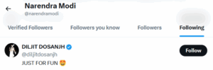 ਦਾ ਐਡੀਟਰ ਨਿਊਜ਼, ਚੰਡੀਗੜ੍ਹ —— ਭਾਰਤ ਦੇ ਪ੍ਰਧਾਨ ਮੰਤਰੀ ਨਰਿੰਦਰ ਮੋਦੀ ਨੇ ਪੰਜਾਬੀ ਅਤੇ ਬਾਲੀਵੁੱਡ ਗਾਇਕ-ਅਦਾਕਾਰ ਦਿਲਜੀਤ ਦੋਸਾਂਝ ਨੂੰ ਐਕਸ (ਟਵਿੱਟਰ) ‘ਤੇ ਫਾਲੋ ਕੀਤਾ ਹੈ। ਇਹ ਕਦਮ ਸੋਸ਼ਲ ਮੀਡੀਆ ‘ਤੇ ਚਰਚਾ ਦਾ ਵਿਸ਼ਾ ਬਣ ਗਿਆ ਹੈ।