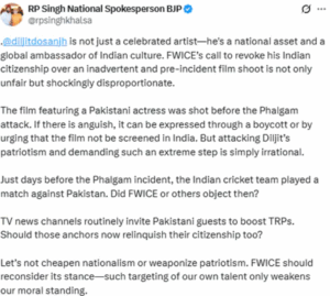 ਦਾ ਐਡੀਟਰ ਨਿਊਜ਼, ਚੰਡੀਗੜ੍ਹ —– ਭਾਰਤੀ ਜਨਤਾ ਪਾਰਟੀ ਦੇ ਰਾਸ਼ਟਰੀ ਬੁਲਾਰੇ ਦਿਲਜੀਤ ਦੋਸਾਂਝ ਦੇ ਸਮਰਥਨ ਵਿੱਚ ਸਾਹਮਣੇ ਆਏ ਹਨ, ਜੋ ਫਿਲਮ ਸਰਦਾਰ ਜੀ-3 ਵਿੱਚ ਪਾਕਿਸਤਾਨੀ ਅਦਾਕਾਰਾ ਹਨੀਆ ਆਮਿਰ ਨਾਲ ਕੰਮ ਕਰਨ ਕਰਕੇ ਵਿਵਾਦਾਂ ਵਿੱਚ ਘਿਰੇ ਹੋਏ ਹਨ। ਭਾਜਪਾ ਦੇ ਰਾਸ਼ਟਰੀ ਬੁਲਾਰੇ ਆਰਪੀ ਸਿੰਘ ਨੇ ਕਿਹਾ – ਦਿਲਜੀਤ ਸਿਰਫ਼ ਇੱਕ ਮਸ਼ਹੂਰ ਕਲਾਕਾਰ ਹੀ ਨਹੀਂ ਹੈ, ਉਹ ਇੱਕ ਰਾਸ਼ਟਰੀ ਸੰਪਤੀ ਹੈ ਅਤੇ ਭਾਰਤੀ ਸੱਭਿਆਚਾਰ ਦਾ ਇੱਕ ਗਲੋਬਲ ਅੰਬੈਸਡਰ ਹੈ। FWICE ਵੱਲੋਂ ਅਣਜਾਣੇ ਵਿੱਚ ਅਤੇ ਘਟਨਾ ਤੋਂ ਪਹਿਲਾਂ ਹੋਈ ਇੱਕ ਫਿਲਮ ਦੀ ਸ਼ੂਟਿੰਗ ਲਈ ਉਸਦੀ ਭਾਰਤੀ ਨਾਗਰਿਕਤਾ ਰੱਦ ਕਰਨ ਦੀ ਮੰਗ ਨਾ ਸਿਰਫ਼ ਅਨੁਚਿਤ ਹੈ, ਸਗੋਂ ਹੈਰਾਨ ਕਰਨ ਵਾਲੀ ਤੌਰ ‘ਤੇ ਅਸੰਗਤ ਵੀ ਹੈ।