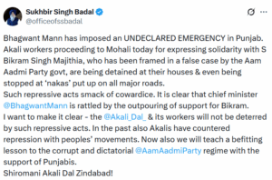 ਉੱਥੇ ਹੀ ਸ਼੍ਰੋਮਣੀ ਅਕਾਲੀ ਦਲ ਦੇ ਪ੍ਰਧਾਨ ਸੁਖਬੀਰ ਸਿੰਘ ਬਾਦਲ ਨੇ ‘ਐਕਸ’ (ਟਵੀਟ) ‘ਤੇ ਪੋਸਟ ਪਾ ਕੇ ਕਿਹਾ ਕਿ, “ਭਗਵੰਤ ਮਾਨ ਨੇ ਪੰਜਾਬ ਵਿਚ ਇਕ ਅਣ-ਐਲਾਨੀ ਐਮਰਜੈਂਸੀ ਲਾਗੂ ਕਰ ਦਿੱਤੀ ਹੈ। ਉਨ੍ਹਾਂ ਕਿਹਾ ਕਿ ਆਮ ਆਦਮੀ ਪਾਰਟੀ ਸਰਕਾਰ ਵਲੋਂ ਝੂਠੇ ਕੇਸ ਵਿਚ ਫਸਾਏ ਗਏ ਬਿਕਰਮ ਸਿੰਘ ਮਜੀਠੀਆ ਨਾਲ ਇਕਜੁੱਟਤਾ ਪ੍ਰਗਟ ਕਰਨ ਲਈ ਅੱਜ ਮੋਹਾਲੀ ਜਾ ਰਹੇ ਅਕਾਲੀ ਵਰਕਰਾਂ ਨੂੰ ਉਨ੍ਹਾਂ ਦੇ ਘਰਾਂ ਵਿਚ ਨਜ਼ਰਬੰਦ ਕੀਤਾ ਜਾ ਰਿਹਾ ਹੈ ਅਤੇ ਸਾਰੀਆਂ ਮੁੱਖ ਸੜਕਾਂ ’ਤੇ ਲਗਾਏ ਗਏ ਨਾਕਿਆਂ ’ਤੇ ਵੀ ਰੋਕਿਆ ਜਾ ਰਿਹਾ ਹੈ। ਅਜਿਹੀਆਂ ਦਮਨਕਾਰੀ ਕਾਰਵਾਈਆਂ ਕਾਇਰਤਾ ਦੀ ਝਲਕ ਦਿੰਦੀਆਂ ਹਨ। ਇਹ ਸਪੱਸ਼ਟ ਹੈ ਕਿ ਮੁੱਖ ਮੰਤਰੀ ਭਗਵੰਤ ਮਾਨ ਬਿਕਰਮ ਲਈ ਸਮਰਥਨ ਦੇ ਵਾਧੇ ਤੋਂ ਘਬਰਾ ਗਏ ਹਨ। ਉਨ੍ਹਾਂ ਅੱਗੇ ਕਿਹਾ ਕਿ ਮੈਂ ਇਹ ਸਪੱਸ਼ਟ ਕਰਨਾ ਚਾਹੁੰਦਾ ਹਾਂ ਕਿ ਅਕਾਲੀ ਦਲ ਅਤੇ ਇਸ ਦੇ ਵਰਕਰ ਅਜਿਹੀਆਂ ਦਮਨਕਾਰੀ ਕਾਰਵਾਈਆਂ ਤੋਂ ਨਹੀਂ ਡਰਨਗੇ। ਪਹਿਲਾਂ ਵੀ ਅਕਾਲੀਆਂ ਨੇ ਲੋਕ ਲਹਿਰਾਂ ਨਾਲ ਦਮਨ ਦਾ ਮੁਕਾਬਲਾ ਕੀਤਾ ਹੈ। ਹੁਣ ਵੀ ਅਸੀਂ ਪੰਜਾਬੀਆਂ ਦੇ ਸਮਰਥਨ ਨਾਲ ਭ੍ਰਿਸ਼ਟ ਅਤੇ ਤਾਨਾਸ਼ਾਹ ਆਮ ਆਦਮੀ ਪਾਰਟੀ ਸ਼ਾਸਨ ਨੂੰ ਢੁਕਵਾਂ ਸਬਕ ਸਿਖਾਵਾਂਗੇ।