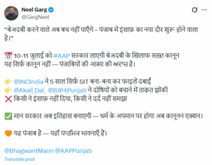 ਅੱਗੇ ਨੀਲ ਗਰਗ ਨੇ ਕਿਹਾ ਕਿ, “ਕਾਂਗਰਸ ਨੇ ਬੇਅਦਬੀ ਦੇ ਖਿਲਾਫ਼ 5 ਸਾਲਾਂ ਤੱਕ ਸਿਰਫ਼ SIT ਬਣਾਈਆਂ ਅਤੇ ਫਾਈਲਾਂ ਨੂੰ ਦਬਾਇਆ। ਉੱਥੇ ਹੀ ਸ਼੍ਰੋਮਣੀ ਅਕਾਲੀ ਦਲ ਅਤੇ ਬੀਜੇਪੀ ਪੰਜਾਬ ਨੇ ਦੋਸ਼ੀਆਂ ਨੂੰ ਬਚਾਉਣ ਲਈ ਆਪਣੀ ਪੂਰੀ ਤਾਕਤ ਲਗਾ ਦਿੱਤੀ ਅਤੇ ਕਿਸੇ ਨੇ ਇਨਸਾਫ਼ ਨਹੀਂ ਦਿੱਤਾ, ਕਿਸੇ ਨੇ ਲੋਕਾਂ ਦੇ ਦਰਦ ਨੂੰ ਨਹੀਂ ਸਮਝਿਆ। ਪਰ ਹੁਣ ਮਾਨ ਸਰਕਾਰ ਇਤਿਹਾਸ ਰਚੇਗੀ – ਹੁਣ ਧਰਮ ਦੇ ਅਪਮਾਨ ‘ਤੇ ਹੋਵੇਗੀ ਕਾਨੂੰਨੀ ਕਾਰਵਾ, ਕਿਉਂਕਿ ਇਹ ਪੰਜਾਬ ਹੈ — ਇੱਥੇ ਧਾਰਮਿਕ ਭਾਵਨਾਵਾਂ ਹਨ।”