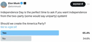 ਮਸਕ ਨੇ 4 ਜੁਲਾਈ, ਅਮਰੀਕਾ ਦੇ ਸੁਤੰਤਰਤਾ ਦਿਵਸ ‘ਤੇ X ‘ਤੇ ਇੱਕ ਪੋਲ ਪੋਸਟ ਕੀਤਾ। ਇਸ ਵਿੱਚ, ਉਸਨੇ ਪੁੱਛਿਆ ਸੀ ਕਿ ਕੀ ਤੁਸੀਂ ਦੋ ਪਾਰਟੀ ਪ੍ਰਣਾਲੀ ਤੋਂ ਆਜ਼ਾਦੀ ਚਾਹੁੰਦੇ ਹੋ ? ਕੀ ਸਾਨੂੰ ਇੱਕ ਅਮਰੀਕਾ ਪਾਰਟੀ ਬਣਾਉਣੀ ਚਾਹੀਦੀ ਹੈ ? ਪੋਲ ਦੇ ਨਤੀਜਿਆਂ ਤੋਂ ਪਤਾ ਲੱਗਾ ਕਿ 65.4% ਲੋਕਾਂ ਨੇ “ਹਾਂ” ਅਤੇ 34.6% ਲੋਕਾਂ ਨੇ “ਨਹੀਂ” ਵਿੱਚ ਵੋਟ ਪਾਈ।