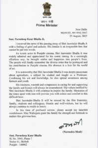 ਇਸ ਦੁੱਖ ਦੀ ਘੜੀ ਵਿਚ ਪ੍ਰਧਾਨ ਮੰਤਰੀ ਮੋਦੀ ਨੇ ਜਸਵਿੰਦਰ ਭੱਲਾ ਦੀ ਪਤਨੀ ਪਰਮਦੀਪ ਕੌਰ ਭੱਲਾ ਨੂੰ ਇਕ ਪੱਤਰ ਲਿੱਖਿਆ ਹੈ, ਜਿਸ ਵਿਚ ਉਹਨਾਂ ਨੇ ਕਿਹਾ, ”ਮੈਨੂੰ ਜਸਵਿੰਦਰ ਭੱਲਾ ਜੀ ਦੇ ਦੇਹਾਂਤ ਦੀ ਖ਼ਬਰ ਬਹੁਤ ਦੁੱਖ ਅਤੇ ਦਰਦ ਨਾਲ ਮਿਲੀ। ਉਨ੍ਹਾਂ ਦਾ ਦੇਹਾਂਤ ਇੱਕ ਨਾ ਪੂਰਾ ਹੋਣ ਵਾਲਾ ਘਾਟਾ ਹੈ, ਜਿਸਨੂੰ ਸ਼ਬਦਾਂ ਵਿੱਚ ਬਿਆਨ ਨਹੀਂ ਕੀਤਾ ਜਾ ਸਕਦਾ। ਪੰਜਾਬੀ ਸਿਨੇਮਾ ਦੇ ਪ੍ਰਸਿੱਧ ਅਦਾਕਾਰ ਸ਼੍ਰੀ ਜਸਵਿੰਦਰ ਭੱਲਾ ਜੀ ਨੂੰ ਉਨ੍ਹਾਂ ਦੇ ਹਾਸਰਸ ਸ਼ੈਲੀ ਲਈ ਵਿਆਪਕ ਤੌਰ ‘ਤੇ ਜਾਣਿਆ ਜਾਂਦਾ ਹੈ। ਉਨ੍ਹਾਂ ਨੇ ਲੋਕਾਂ ਦੇ ਜੀਵਨ ਵਿੱਚ ਮੁਸਕਰਾਹਟ ਅਤੇ ਖੁਸ਼ੀਆਂ ਲਿਆਂਦੀਆਂ।”