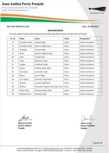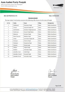 ਦਾ ਐਡੀਟਰ ਨਿਊਜ਼, ਚੰਡੀਗੜ੍ਹ —– ਪੰਜਾਬ ਵਿੱਚ ਹੜ੍ਹਾਂ ਦੀ ਸਥਿਤੀ ਦੇ ਵਿਚਕਾਰ, ਆਮ ਆਦਮੀ ਪਾਰਟੀ ਨੇ ਕਿਸਾਨ ਹਲਕਾ ਕੋਆਰਡੀਨੇਟਰ ਨਿਯੁਕਤ ਕੀਤੇ ਹਨ। 23 ਜ਼ਿਲ੍ਹਿਆਂ ਵਿੱਚ 110 ਲੋਕਾਂ ਨੂੰ ਇਹ ਜ਼ਿੰਮੇਵਾਰੀ ਸੌਂਪੀ ਗਈ ਹੈ। ਇਸਦਾ ਉਦੇਸ਼ ਇੱਕ ਪਾਸੇ ਸੰਗਠਨ ਦਾ ਵਿਸਥਾਰ ਕਰਨਾ ਹੈ, ਅਤੇ ਦੂਜੇ ਪਾਸੇ ਇਸ ਮੁਸ਼ਕਲ ਸਮੇਂ ਵਿੱਚ ਲੋਕਾਂ ਦੀ ਬਿਹਤਰ ਢੰਗ ਨਾਲ ਸਹਾਇਤਾ ਕਰਨਾ ਹੈ। ਇਸ ਸਮੇਂ ਆਮ ਆਦਮੀ ਪਾਰਟੀ ਦੇ ਸਾਰੇ ਆਗੂ, ਵਿਧਾਇਕ ਅਤੇ ਮੰਤਰੀ ਹੜ੍ਹ ਪ੍ਰਭਾਵਿਤ ਖੇਤਰਾਂ ਵਿੱਚ ਲੱਗੇ ਹੋਏ ਹਨ। ਇਸ ਹੜ੍ਹ ਨੂੰ ਹੁਣ ਤੱਕ ਦਾ ਸਭ ਤੋਂ ਖਤਰਨਾਕ ਹੜ੍ਹ ਦੱਸਿਆ ਜਾ ਰਿਹਾ ਹੈ। ਆਮ ਆਦਮੀ ਪਾਰਟੀ ਹਲਕਾ ਕੋਆਰਡੀਨੇਟਰ ਸੂਚੀ…..
