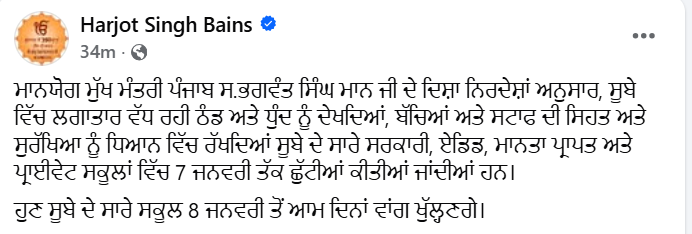ਸਿੱਖਿਆ ਮੰਤਰੀ ਹਰਜੋਤ ਸਿੰਘ ਬੈਂਸ ਨੇ X ‘ਤੇ ਲਿਖਿਆ: “ਮਾਨਯੋਗ ਮੁੱਖ ਮੰਤਰੀ ਪੰਜਾਬ ਸ.ਭਗਵੰਤ ਸਿੰਘ ਮਾਨ ਜੀ ਦੇ ਦਿਸ਼ਾ ਨਿਰਦੇਸ਼ਾਂ ਅਨੁਸਾਰ, ਸੂਬੇ ਵਿੱਚ ਲਗਾਤਾਰ ਵੱਧ ਰਹੀ ਠੰਡ ਅਤੇ ਧੁੰਦ ਨੂੰ ਦੇਖਦਿਆਂ, ਬੱਚਿਆਂ ਅਤੇ ਸਟਾਫ ਦੀ ਸਿਹਤ ਅਤੇ ਸੁਰੱਖਿਆ ਨੂੰ ਧਿਆਨ ਵਿੱਚ ਰੱਖਦਿਆਂ ਸੂਬੇ ਦੇ ਸਾਰੇ ਸਰਕਾਰੀ, ਏਡਿਡ, ਮਾਨਤਾ ਪ੍ਰਾਪਤ ਅਤੇ ਪ੍ਰਾਈਵੇਟ ਸਕੂਲਾਂ ਵਿੱਚ 7 ਜਨਵਰੀ ਤੱਕ ਛੁੱਟੀਆਂ ਕੀਤੀਆਂ ਜਾਂਦੀਆਂ ਹਨ। ਹੁਣ ਸੂਬੇ ਦੇ ਸਾਰੇ ਸਕੂਲ 8 ਜਨਵਰੀ ਤੋਂ ਆਮ ਦਿਨਾਂ ਵਾਂਗ ਖੁੱਲ੍ਹਣਗੇ।”