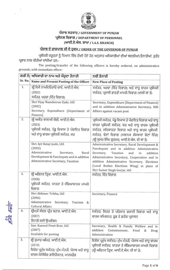 ਦਾ ਐਡੀਟਰ ਨਿਊਜ਼, ਚੰਡੀਗੜ੍ਹ ——- ਪੰਜਾਬ ਸਰਕਾਰ ਵੱਲੋਂ 26 IAS/PCS ਅਫਸਰਾਂ ਦਾ ਤਬਾਦਲਾ ਕੀਤਾ ਗਿਆ ਹੈ। ਪੂਰੀ ਸੂਚੀ ਹੇਠਾਂ ਦੇਖੋ…….