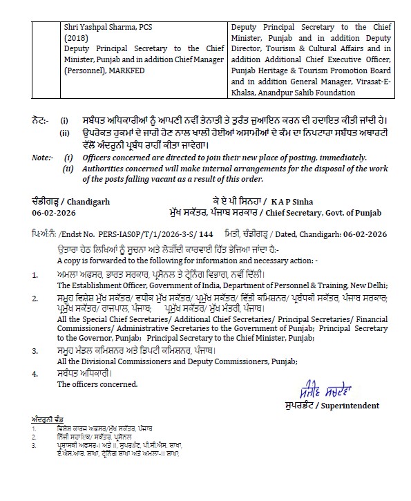 ਦਾ ਐਡੀਟਰ ਨਿਊਜ਼, ਚੰਡੀਗੜ੍ਹ —– ਪੰਜਾਬ ‘ਚ 4 IAS/PCS ਅਫ਼ਸਰਾਂ ਦੇ ਤਬਾਦਲੇ ਕੀਤੇ ਗਏ ਹਨ। ਇਨ੍ਹਾਂ ਵਿਚ 2 IAS ਤੇ 2 PCS ਅਫ਼ਸਰ ਸ਼ਾਮਲ ਹਨ। ਪੂਰੀ ਲਿਸਟ ਹੇਠਾਂ ਪੜ੍ਹੋ….