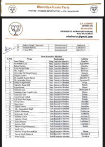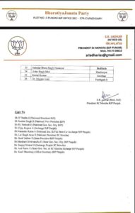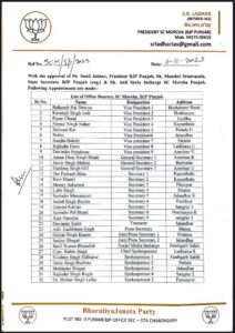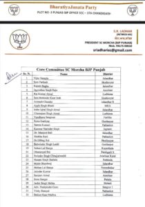 ਦਾ ਐਡੀਟਰ ਨਿਊਜ਼, ਚੰਡੀਗੜ੍ਹ ——— ਅੱਜ ਪੰਜਾਬ ਭਾਜਪਾ ਐੱਸਸੀ ਮੋਰਚਾ ਦੇ ਸੂਬਾ ਪ੍ਰਧਾਨ ਐਸ ਆਰ ਲੱਧੜ ਨੇ ਪੰਜਾਬ ਭਾਜਪਾ ਦੇ ਸੂਬਾ ਪ੍ਰਧਾਨ ਸੁਨੀਲ ਜਾਖੜ, ਸੂਬਾ ਜਨਰਲ ਸਕੱਤਰ (ਸੰਗਠਨ) ਮੰਥਰੀ ਸ੍ਰੀ ਨਿਵਾਸਲੂ ਤੇ ਐੱਸਸੀ ਮੋਰਚਾ ਦੇ ਪ੍ਰਭਾਰੀ ਤੇ ਸੂਬਾ ਜਨਰਲ ਸਕੱਤਰ ਅਨਿਲ ਸਾਰੀਨ ਦੇ ਨਾਲ ਸਲਾਹ ਮਸ਼ਵਰੇ ਤੋ ਬਾਅਦ ਐੱਸਸੀ ਮੋਰਚਾ ਦੇ 9 ਸੂਬਾ ਮੀਤ ਪ੍ਰਧਾਨ ,ਤਿੰਨ ਸੂਬਾ ਜਨਰਲ ਸਕੱਤਰ, 9 ਸੂਬਾ ਸਕੱਤਰ, 1 ਕੈਸ਼ੀਅਰ, ਇੱਕ ਪ੍ਰੈਸ ਸਕੱਤਰ,ਦੋ ਜੋਇਟ ਪ੍ਰੈਸ ਸਕੱਤਰ, ਇੱਕ ਮੁੱਖ ਬੁਲਾਰਾ, ਪੰਜ ਬੁਲਾਰੇ ਕੁੱਲ 35 ਅਹੁਦੇਦਾਰ,32 ਸੂਬਾ ਕਮੇਟੀ ਮੈਂਬਰ, 36 ਐੱਸਸੀ ਮੋਰਚਾ ਕੋਰ ਕਮੇਟੀ ਮੈਂਬਰਾ ਦਾ ਐਲਾਨ ਕੀਤਾ ਗਿਆ। ਪੜ੍ਹੋ ਪੂਰਾ ਵੇਰਵਾ…….