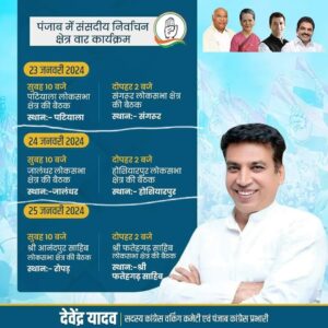 ਕਾਂਗਰਸੀ ਆਗੂ ਨਵੇਂ ਸੂਬਾ ਇੰਚਾਰਜ ਦੇਵੇਂਦਰ ਯਾਦਵ ਦੀ ਅਗਵਾਈ ‘ਚ ਤਿੰਨ ਦਿਨਾਂ ਵਿੱਚ ਛੇ ਲੋਕ ਸਭਾ ਹਲਕਿਆਂ ਨੂੰ ਕਵਰ ਕਰਨਗੇ। ਪਹਿਲੀ ਮੀਟਿੰਗ 23 ਜਨਵਰੀ ਨੂੰ ਸਵੇਰੇ 10 ਵਜੇ ਪਟਿਆਲਾ ਵਿਖੇ ਹੋਵੇਗੀ। ਪਾਰਟੀ ਆਗੂ ਦੁਪਹਿਰ 2 ਵਜੇ ਸੰਗਰੂਰ ਵਿੱਚ ਵਰਕਰਾਂ ਨਾਲ ਮੁਲਾਕਾਤ ਕਰਨਗੇ।